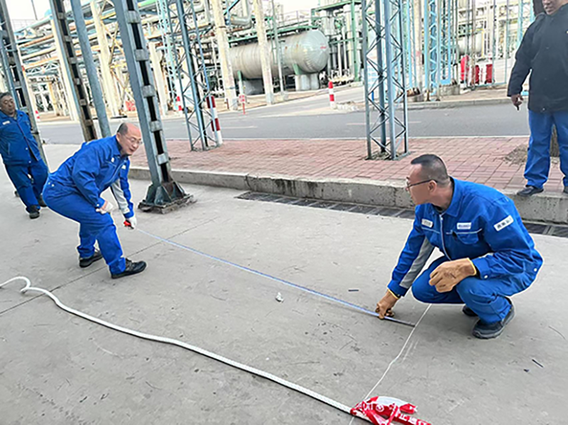 賽前,精聯(lián)公司黨支部書記兼總經(jīng)理宋連軍對(duì)本場賽事提出要求:非常時(shí)期,必須把安全放在首位。心中有了安全這根紅線,在賽事的準(zhǔn)備過程中加倍用心。首先,繩索選擇結(jié)實(shí)耐用的尼龍繩。其次,參賽班員穿好防砸鞋防滑并防止崴腳,戴好手套防止手被磨破。最后,場地選擇辦公樓前空地,遠(yuǎn)離道路。為體現(xiàn)比賽的公平性,精聯(lián)公司副總經(jīng)理徐巖基拿出卷尺丈量中心線;為鼓舞士氣,駐廠的管理人員也分別加入兩個(gè)班組進(jìn)行助力。