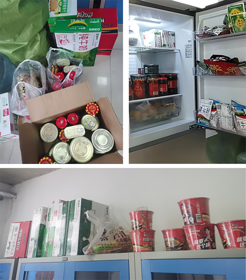 而本輪疫情的不確定因素,使生活物資的儲(chǔ)備成了亟待解決的問(wèn)題。精聯(lián)公司黨支部書(shū)記兼總經(jīng)理宋連軍、副總經(jīng)理徐巖基多渠道分別購(gòu)買(mǎi)了充足的物資,冰箱里滿滿登登的牛奶、水果、罐頭、下飯菜、醬類(lèi),地上的編織袋里各種薯片、瓜子、果凍等零食,就連工具箱上面也堆滿了方便面和牛奶。保證我們19名員工營(yíng)養(yǎng)充分的同時(shí),也讓味蕾不再單調(diào)乏味。