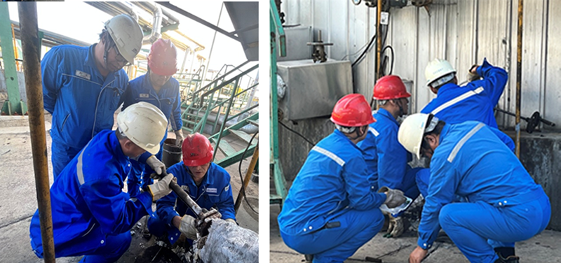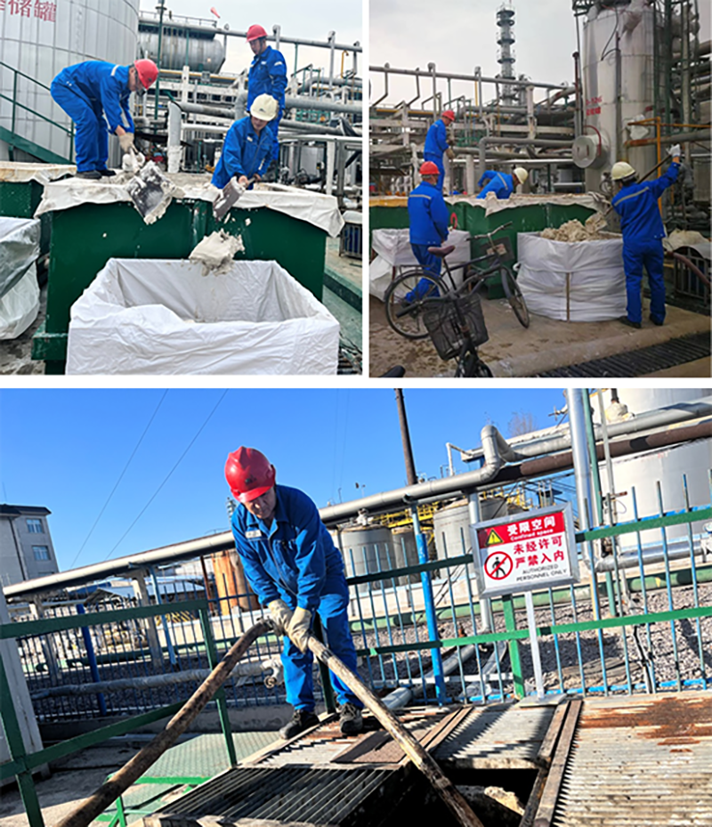 由于勞務(wù)人員不能進(jìn)廠,為了不影響正常生產(chǎn),三廢產(chǎn)出物由當(dāng)班班組以及值班管理人員共同清運(yùn),大家你一鍬我一鍬把廢渣由渣槽倒入編織袋封存入庫(kù)并進(jìn)行登記,等待解封后第一時(shí)間依法合規(guī)處理。在工藝廢水排放前,班長(zhǎng)通過(guò)不斷調(diào)整管子的角度來(lái)抽取工藝廢水中的渣子,確保排入石化工藝污水中懸浮物、COD、含油等指標(biāo)合格。